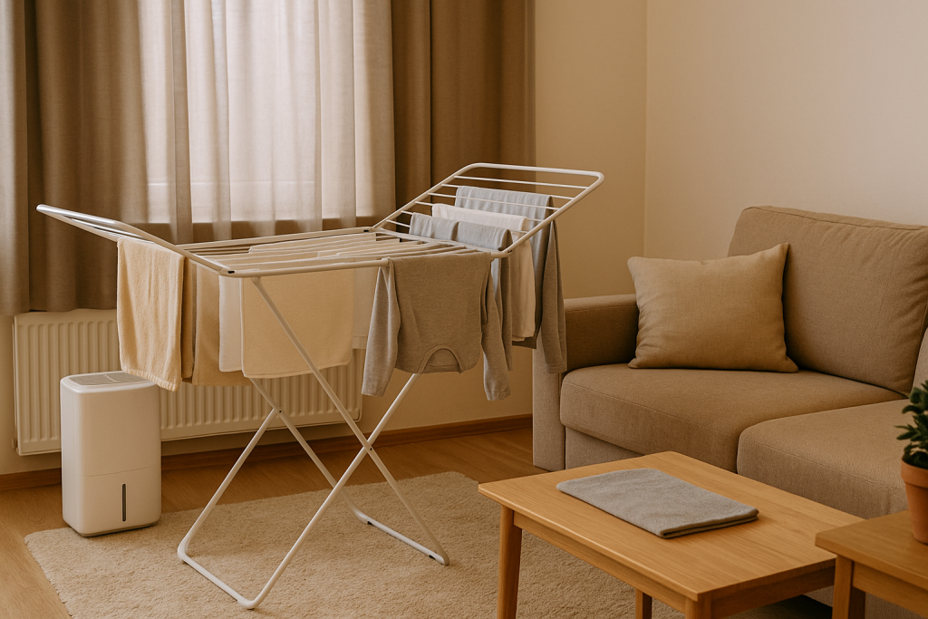 가장 처음으로 중요한 건 습도 조절이에요. 빨래를 방 안에서 말리면 습도가 금방 70~80%까지 올라가요. 저는 습도가 60%를 넘기 시작하면 바로 조치를 해요. 가장 간단한 건 제습기를 켜두는 거예요. 만약 제습기가 없으면 선풍기만 돌려줘도 공기 순환이 잘 되면서 건조 시간이 많이 줄어들어요. 특히 빨래 가까이에 선풍기를 약하게 틀면 공기가 고이지 않아서 훨씬 빨리 마르더라구요.